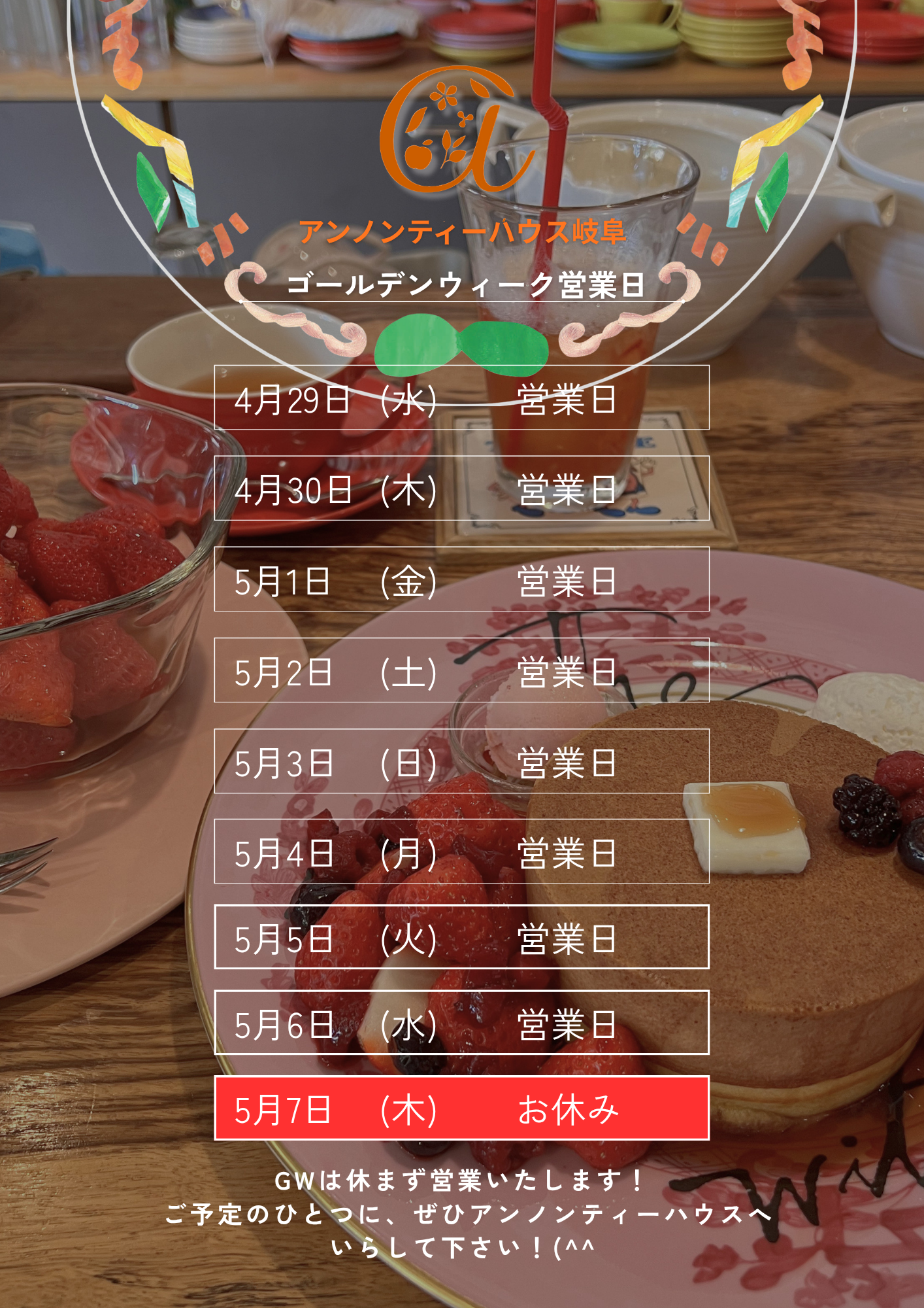 アンノンティーハウスからゴールデンウィーク営業日のお知らせです。