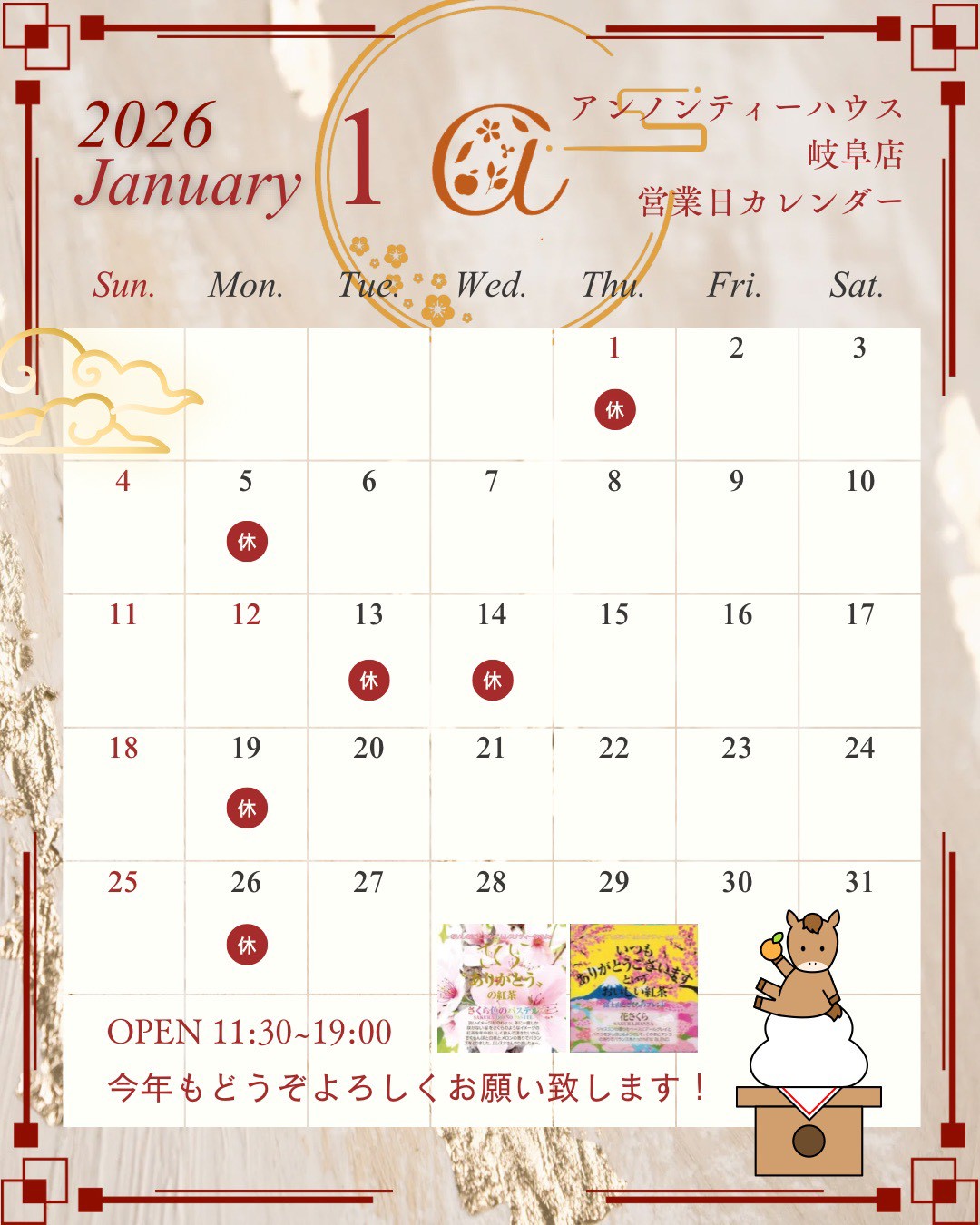JOURNAL 2026.01.01 NEWS 1月の営業日 アンノンティーハウスから1月の営業日のお知らせです。 皆様、新年明けましておめでとうございます。スリランカ最高級紅茶ムレスナティー正規代理店アンノンティーハウスです。本日もご来店ありがとうございます。(^^さて今回は表題の通り、1月の営業日についてお知らせ致します。各店舗で営業時間が異なりますのでお間違えのないようお気をつけください。 ●岐阜本店 11:30 OPEN / 18:00 LO / 19:00 CLOSE1日(月)・5日(月)・13日(火)・14日(水)・19日(月)・26日(月)以上お休み頂きます。 ●大名古屋ビルヂング店 11:00 OPEN / 19:00 LO / 20:00 CLOSE1日(月)元旦のみお休み。 皆様のご来店をお待ちしております!+ HAPPY TEA TIME +
